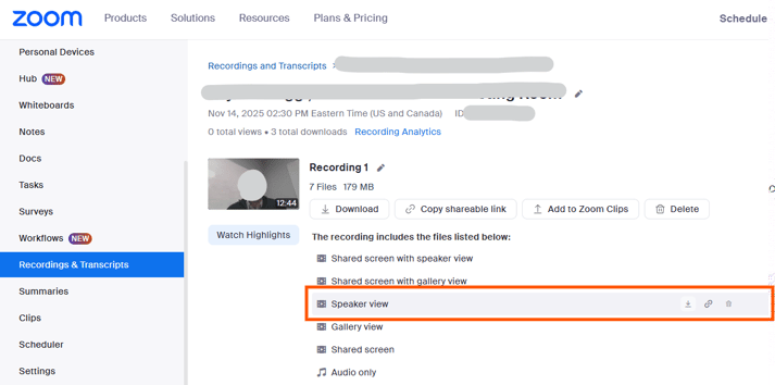 Step 2 - After your event, download the appropriate file. E.g. you can download the Speaker view file, which shows only the speakers and not slides/screenshare.