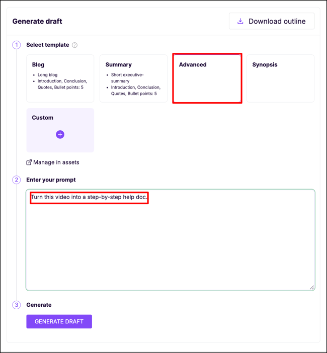 Log in to your account >> Upload/Link your video >> Go to Writer Module (Advanced Option) >> Add a prompt "Turn this video into a step-by-step help doc."