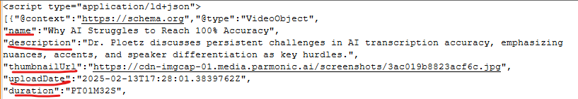 JSON-LD talks to crawlers in their language and provides the name, description, thumbnail, duration, publish date, etc. so search engines can see, understand, and recommend your content.